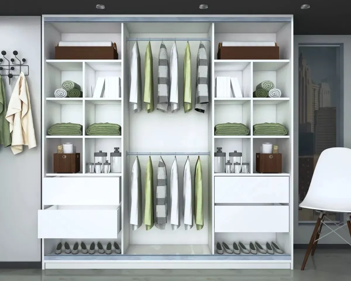 – 2 Barrales para colgar toda la ropa que necesites, como camperas, pantalones, vestidos, etc. También podes optar por dejar solo el barral de arriba para tener un espacio de ropa larga (opcional a tu gusto y elección)